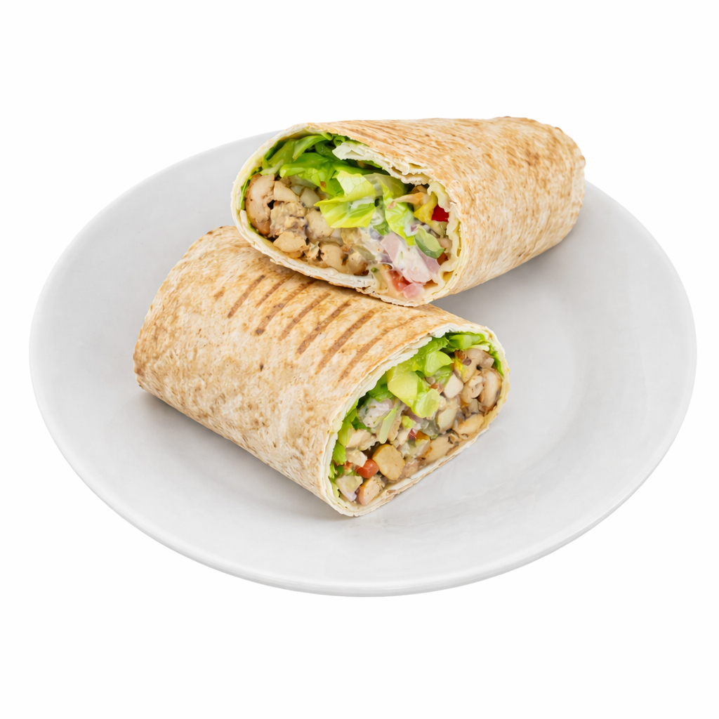 Grilled shawarma chicken • Light garlic sauce • Tomatoes • Onions • Pickles • Tortilla