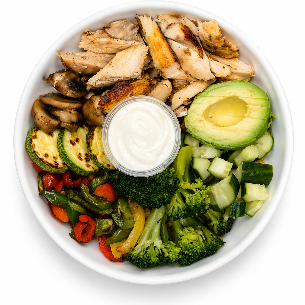 Chicken, cauliflower rice, mixed vegetables, sautéed broccoli, cucumber, avocado, sour cream