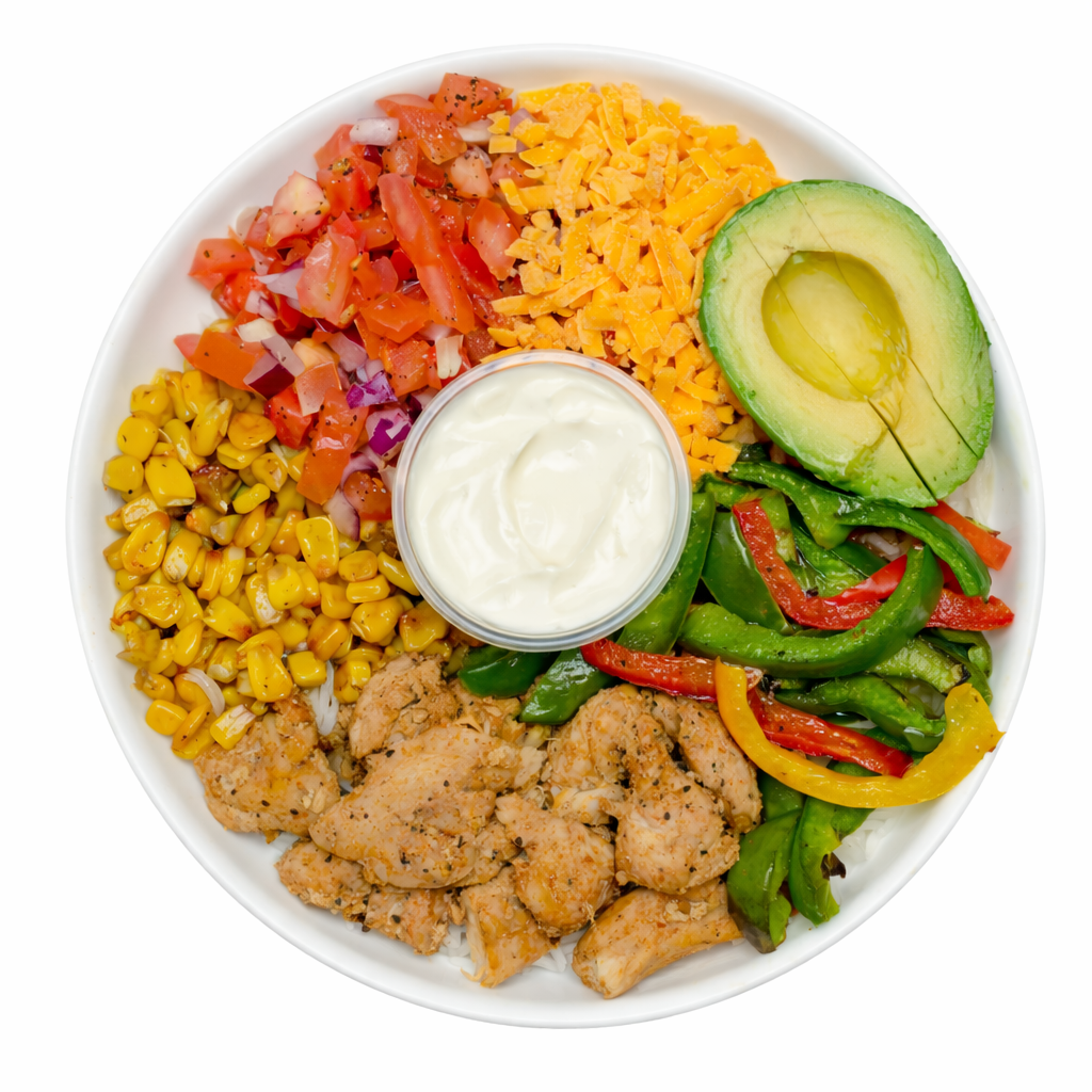 Chicken fajita, rice, avocado, cheddar cheese, sautéed peppers, roasted corn, fresh salsa, sour cream
