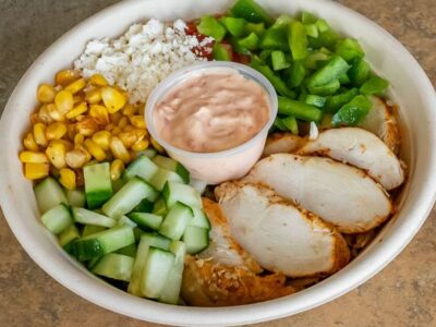 + Free ShippingChicken Shawarma, Rice, Roast Corn, Red Onions, Tomatoes, Cucumber, Pickles, Feta Cheese, Garlic Sauce on the side