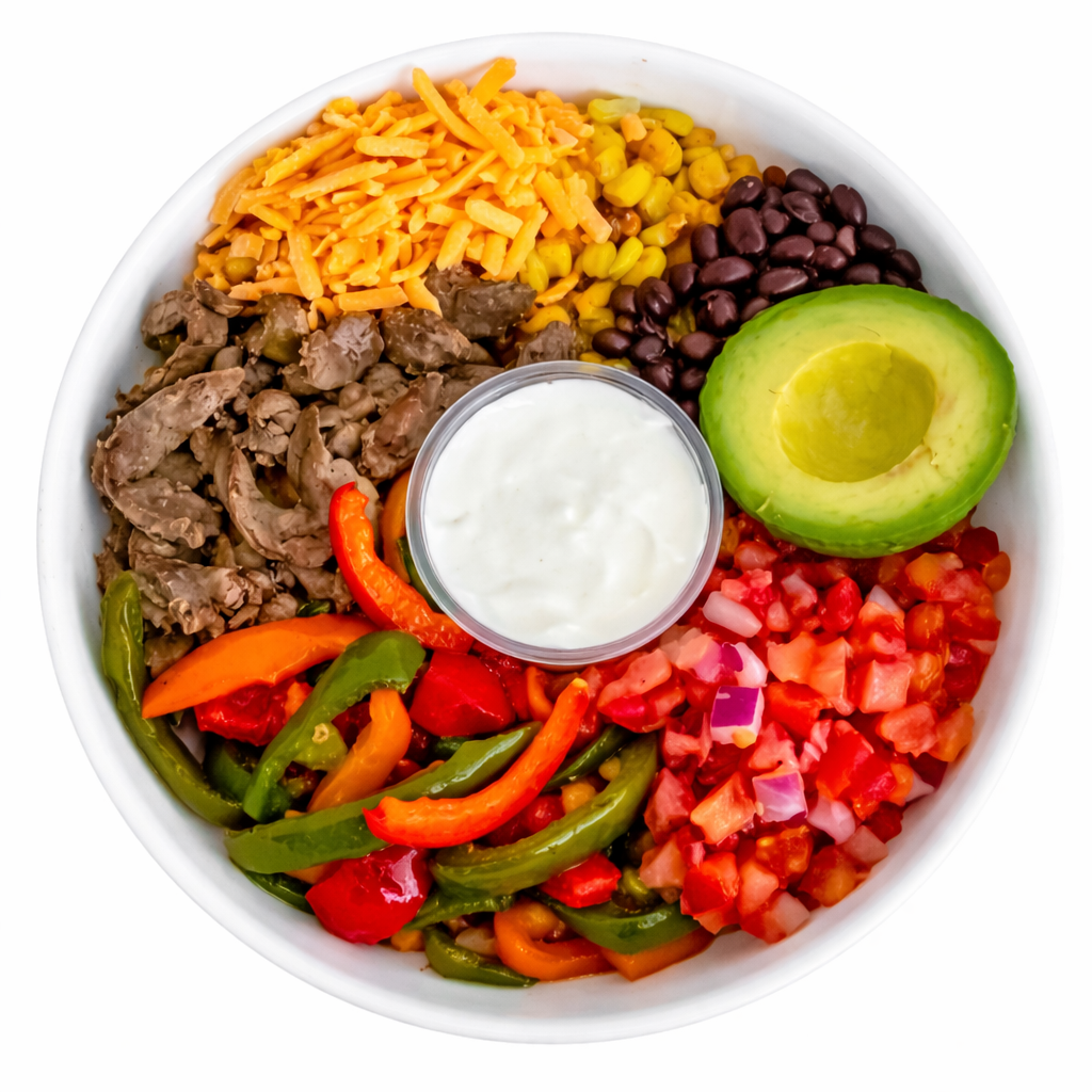 Organic beef, rice, corn, black beans, roasted peppers, salsa, avocado, cheddar cheese, sour cream