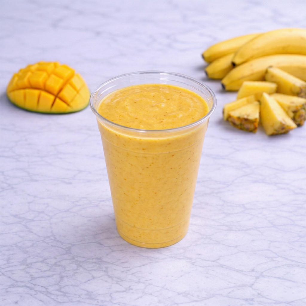 225 kcal | 2g Protein | 56g Carbs | 1g Fat Pineapple, Mango, Banana, Coconut Water No Sugar added lactose free